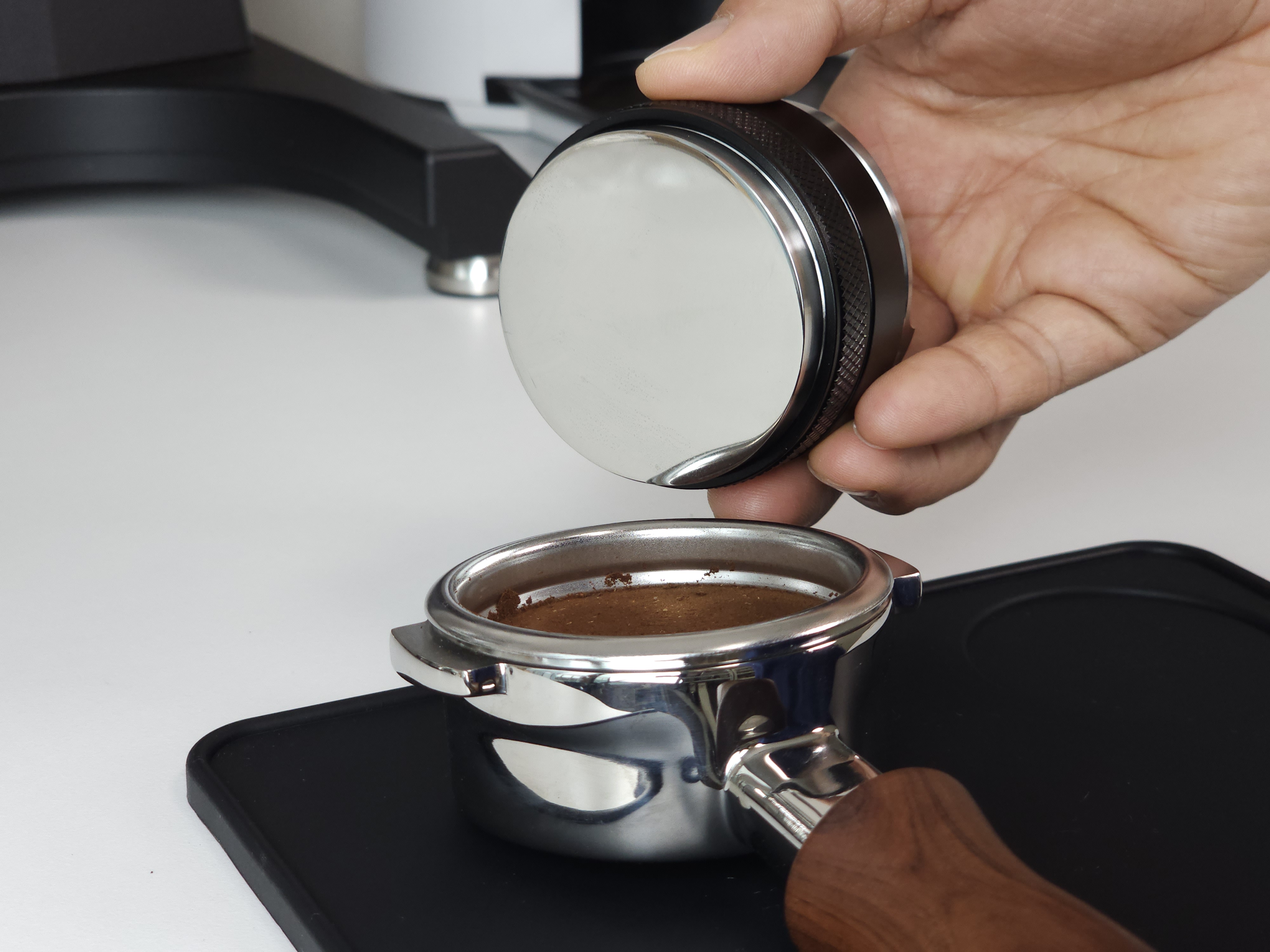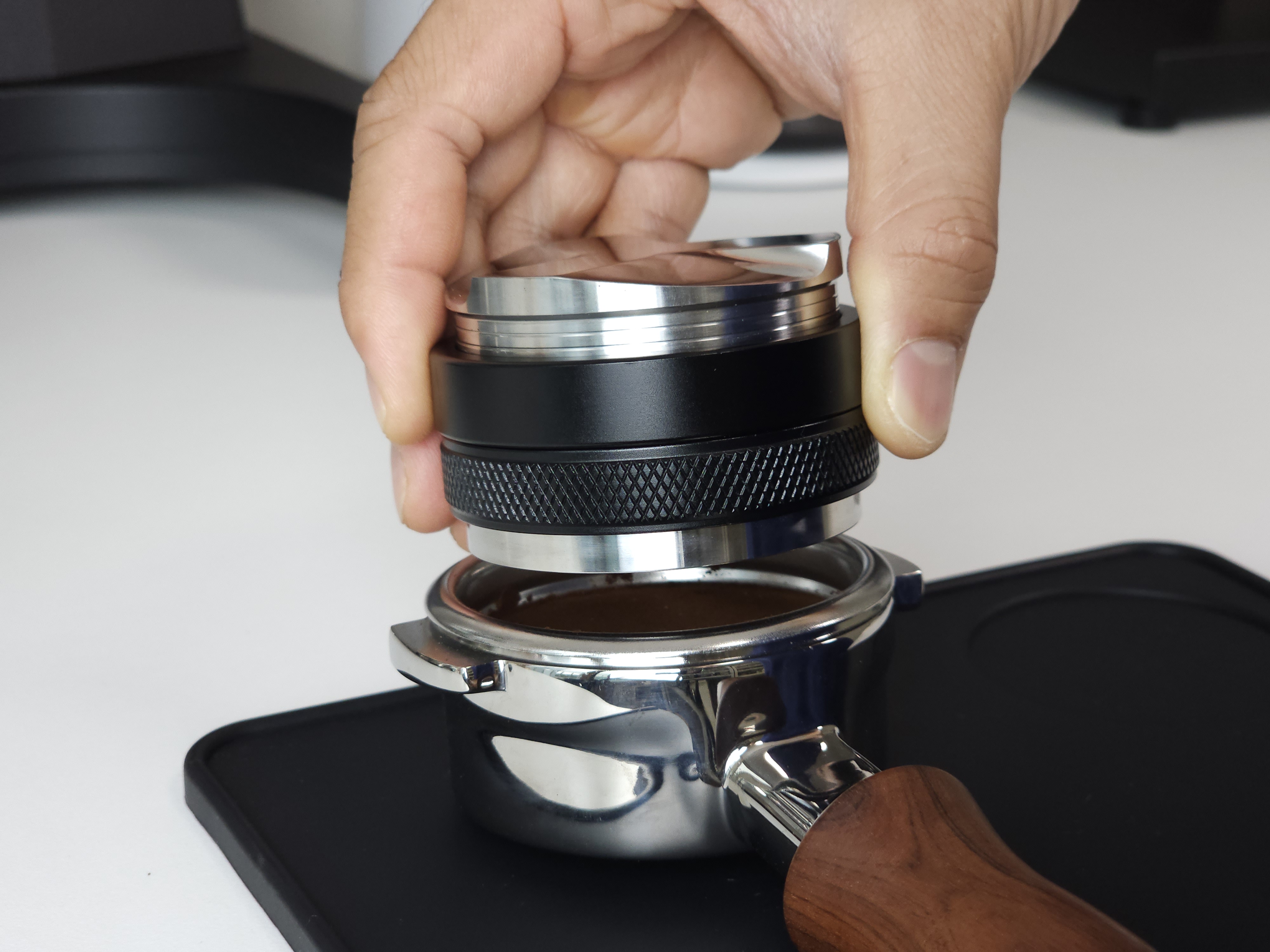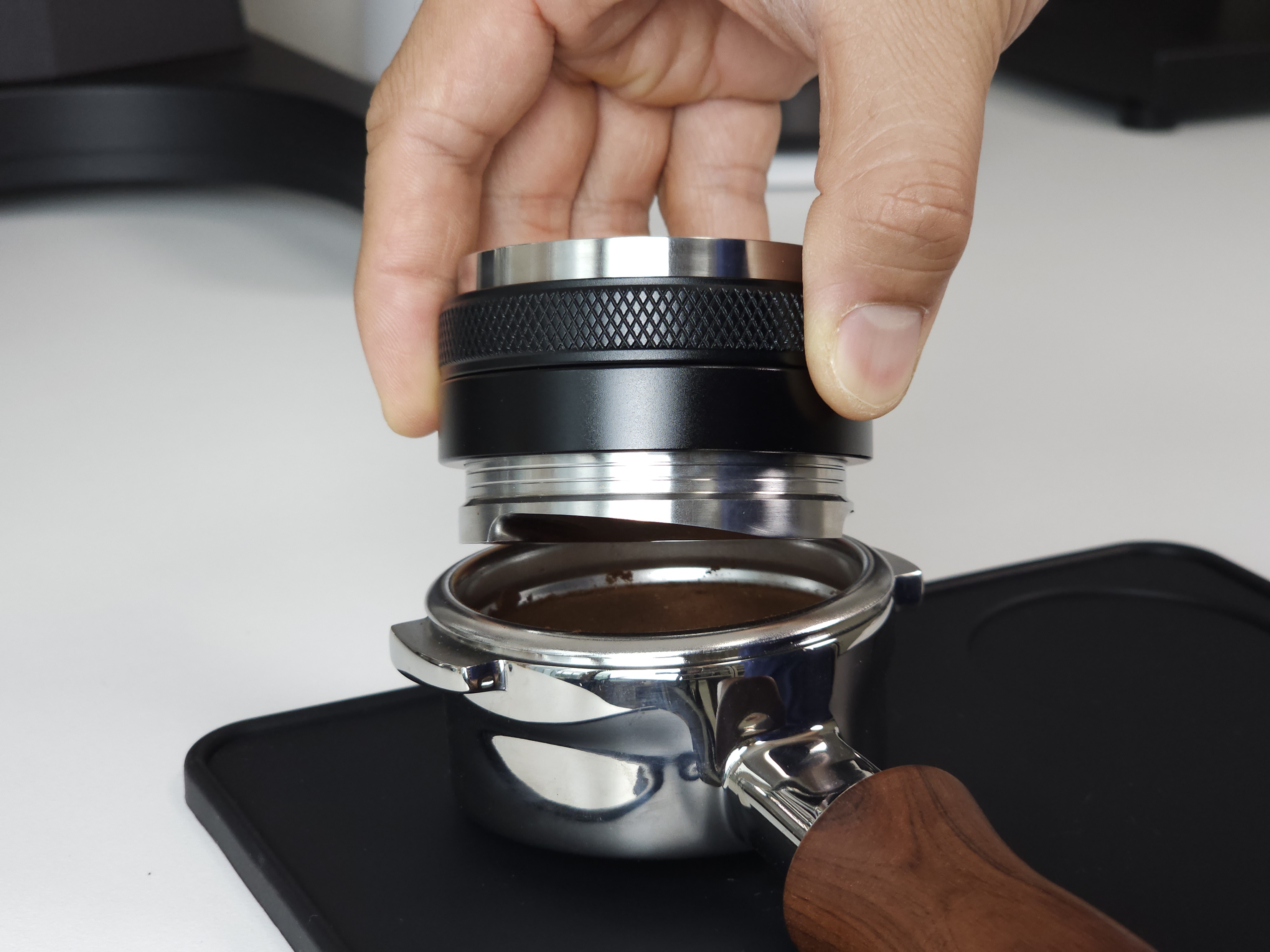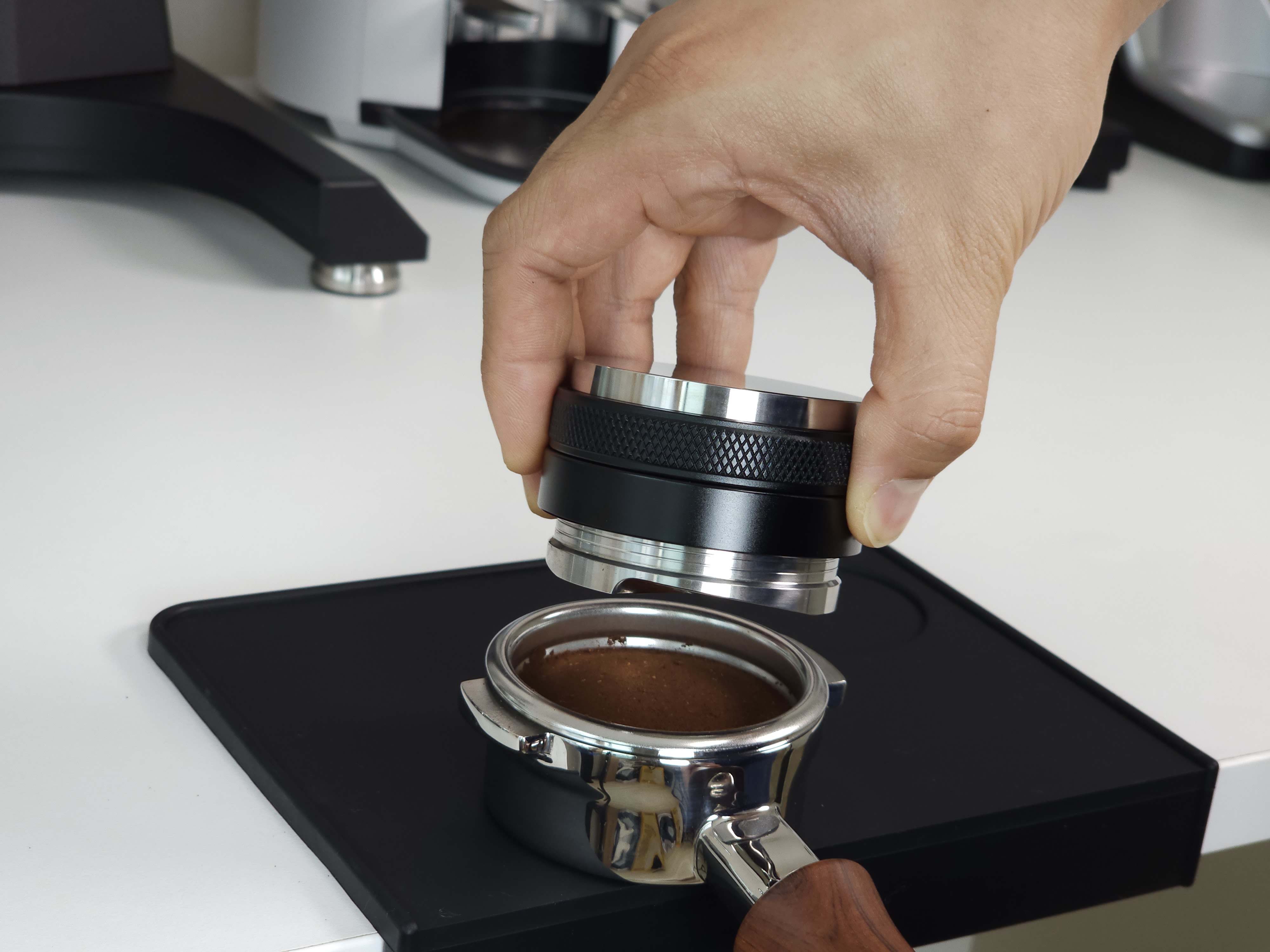 탬퍼 타입의 경우 Flat 베이스로 제작되어 일자로 탬핑이 가능합니다. 레벨링툴 더블의 검은색 테두리가 바스켓 엣지부분에 닿게 되어 항상 수평적인 탬핑이 가능합니다. 단, 템퍼 파츠의 길이를 조금 길게 빼셔야 합니다:)